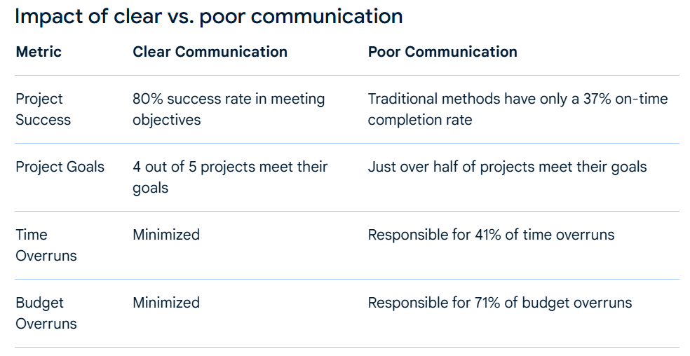 MEP engineering is a technically complex area. However, it is sometimes necessary to engage and communicate with stakeholders who may not have an engineering or technical background on these complex MEP services. The ability to clearly communicate and explain such complex engineering matters effectively ensures that, technical details are understood by clients, architects, contractors, and site teams. This minimises the risk of misunderstandings of drawings, technical information or instructions which could otherwise lead to costly errors and disagreements. Also, it is often necessary to give regular progress updates on MEP works to relevant third parties through progress reports and meetings. This requires strong verbal and written communication skills to ensure that there are no ambiguities regarding the state of the works being communicated. Thus, the ability to communicate clearly is an indispensable soft asset that every MEP Professional should learn to master in order to enhance their efficiency. The table below from a quick internet search gives an indication of how clear communication impacts project delivery: